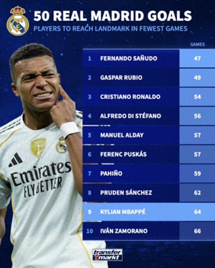 姆巴佩打进50球用了64场比赛,在皇骑兵史排名第9。