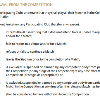 亚冠精英联赛2024-25赛季竞赛规程第5.2条设施,存在以下算作被视为退出亚冠精英联赛:1、书面见告亚足联不策画或无法到方位报到/进入比赛;2、未能到方位报说念/进入比赛;3、闭幕或未能链接进行比赛;4、在比赛物化前离开开通场;5、被抽签阶段后被任何主宰机构抹杀、暂停或不容进入任何阶段的比赛;6、在干系比赛安排后被任何主宰机构抹杀、暂停或不容进入任何阶段的比赛。